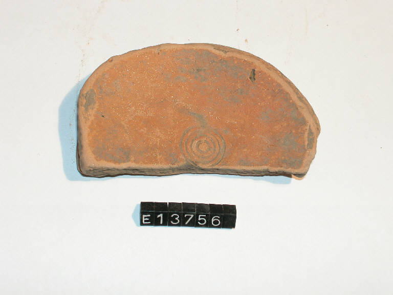 Frammento di piede ad anello; è dipinta la superficie interna che presenta pure una decorazione a stampigliatura a cerchi concentrici.
