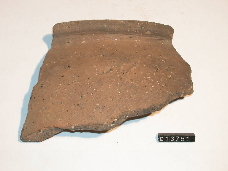 Frammento di orlo e parete di olla con labbro estroflesso arrotondato e decorazione a tacche incise sulla spalla.