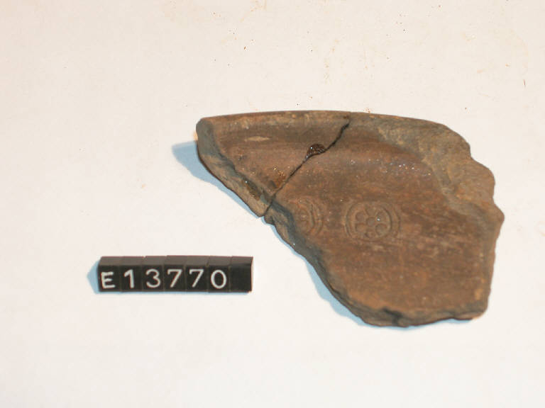 Frammento di patera con due rosette imnpresse a stampiglia. Orlo assottigliato rientrante.