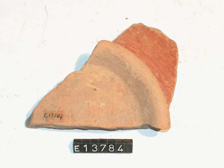 Frammento di piede leggermente obliquo con tracce di dipintura interna ed esterna.