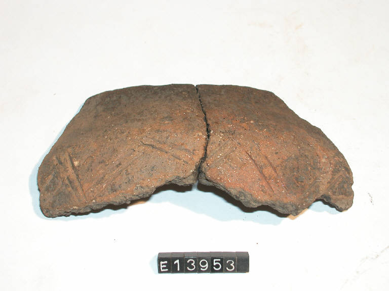 Frammento di orlo e parete di olletta troncoconica ad orlo piatto, decorata sulla spalla da solchi a zig zag distanziati.
