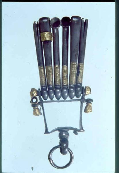 Corredo da toilette costituito da un oggetto in argento ornato da laminette in oro. Il reperto si compone di una porzione quadrangolare che su di un lato reca un anello fisso con anello mobile funzionale probabilmente ad attaccare l'oggetto al sommo dell'arco di una fibula a navicella. Sul lato opposto si attaccano sei strumenti da toilette fra i quali si distinguono due nettaorecchie, due spatoline e due pinzette. Tutti e sei gli strumenti presentano una estremità arrotondata con foro passante trasversale per l'inserimento di un supporto unico, con estremità decorate in lamina d'oro , inserito nel sostegno quadrangolare. Gli strumenti stessi presentano una decorazione costituita da un sottile filo in oro avvolto intorno all'estremità più affusolata. Una delle spatoline è inoltre decorata da un anello a fascia in oro infilato sul supporto. L'oggetto è poi ornato sui lati esterni da due campanellini in lamina d'oro posti in corrispondenza delle due estremità del supporto orizzontale.