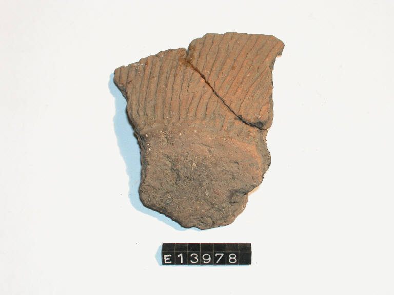 Frammento di fondo piatto e parete di olla. Decorazione incisa sulla parete esterna a righe parallele verticali.