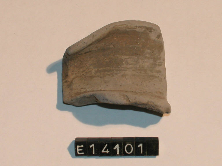 Frammento di orlo e parete di olla con alto labbro esoverso. Superficie grigia.