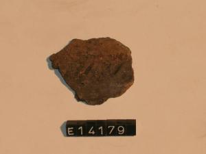 Frammento di olletta decorata da tratti obliqui sopra la spalla.