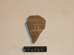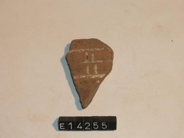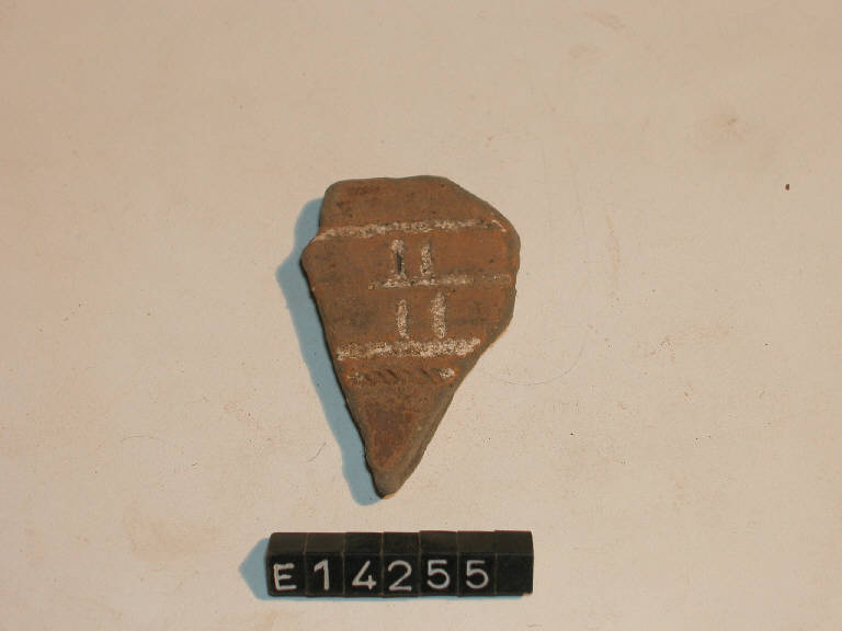 Frammento di parete di recipiente con decorazione esterna a linee orizzontali incise, campite di pasta bianca.