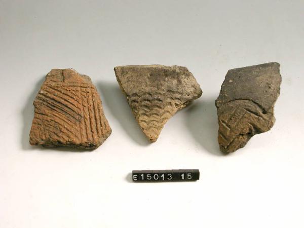 Frammento di parete di olla decorata esternamente da linee oblique e verticali a pettine.