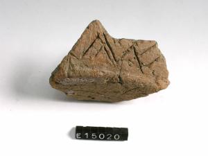 Frammento di fondo e parete di vaso con fondo piatto e parete troncoconica; decorazione esterna formata da linee a zigzag profondamente incise.