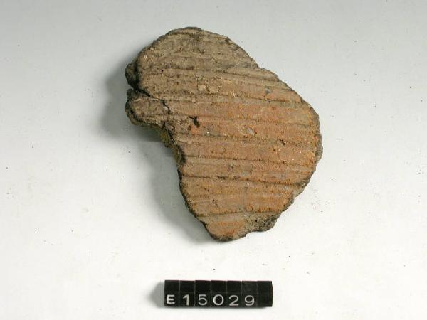 Frammento di orlo e parete di olla decorata esternamente con linee parallele ottenute a pettine