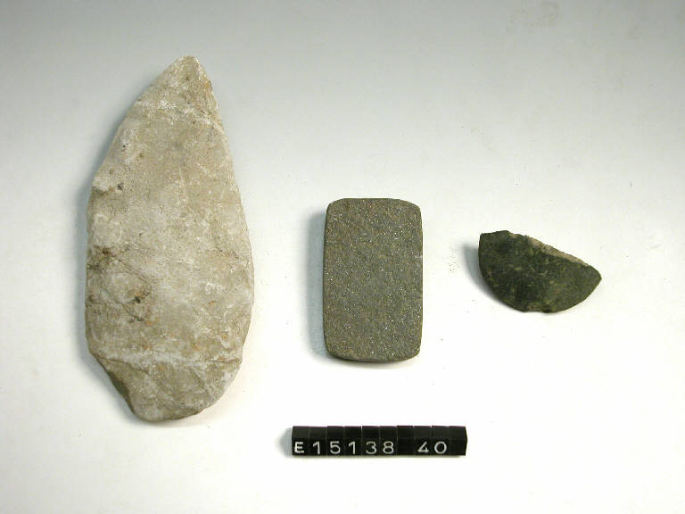 Ciottolo (o manufatto) di forma ogivale biconvessa. Non sono rilevabili tracce di scheggiatura o altri tipi di lavorazione.