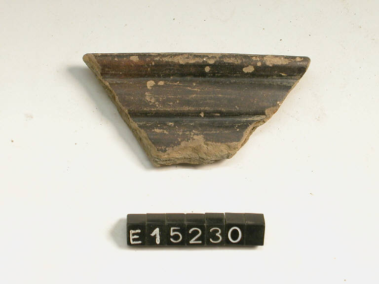 Frammento di orlo e parete pertinente a bicchiere carenato con orlo cordonato e labbro decorato da costolature; superficie esterna di colore nero lucido.