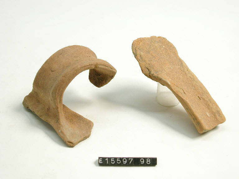 Frammento di ansa a nastro insellato con frammento di parete a superficie di colore rossiccio.