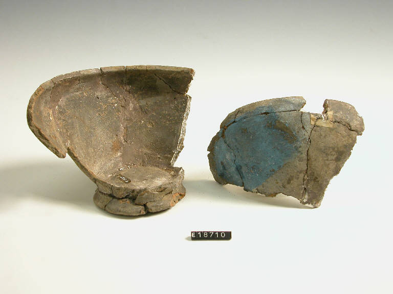 Scodella a corpo troncoconico con labbro rientrante e orlo obliquo all'interno; basso piede troncoconico.