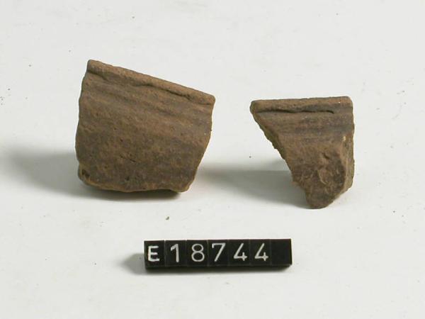 Frammento di labbro con orlo obliquo all'interno con tre scanalature sotto l'orlo.
