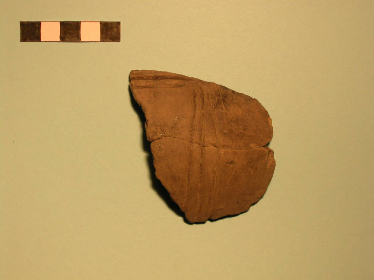 Tre frammenti ricomposti di paretepertinente a vaso di forma globosa; sono decorati da fasci di tre profonde incisioni che convergono a formare un motivo a croce.