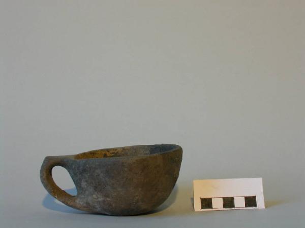 Tazza emisferica, orlo piatto, fondo piano-convesso; tra orlo e fondo è impostata un'ansa a gomito con braccio superiore orizzontale.