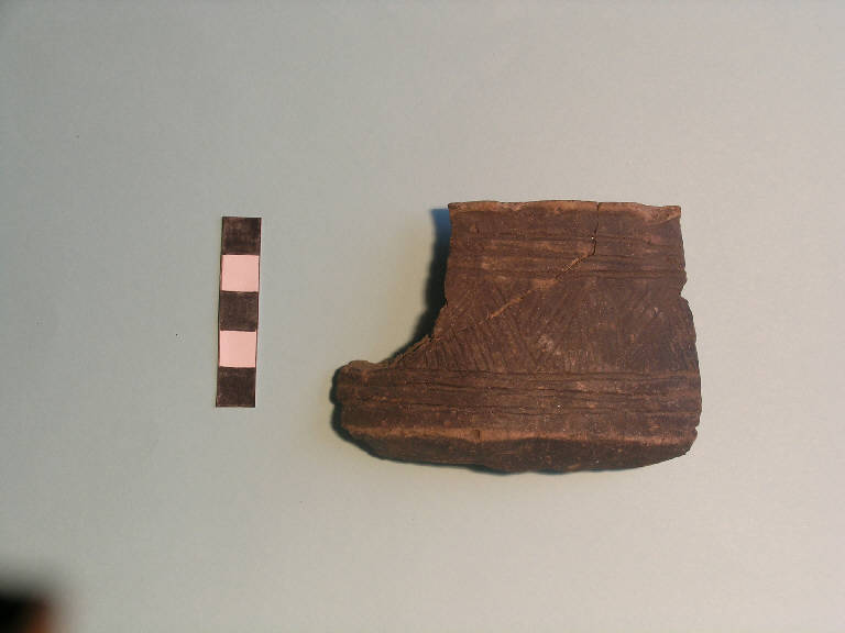 Scodella carenata, orlo obliquo, alta parete verticale rettilinea decorata da due fasci di tre linee incise orizzontali che racchiudono un motivo inciso a denti di lupo campiti.
