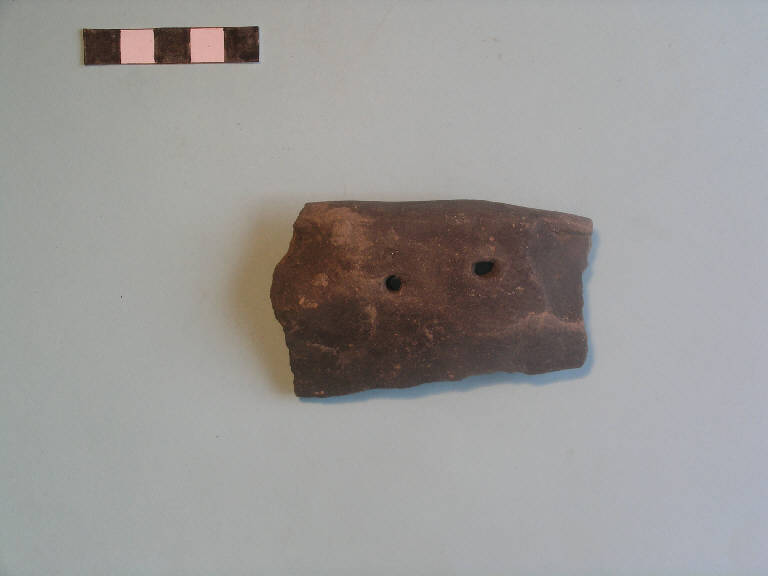 Frammento di scodellone carenato, orlo obliquo verso l'esterno, parete svasata concava, carena arrotondata; tra orlo e carena ci è un ingrossamento (ansa canaliculata impervia), con due fori di sospensione.