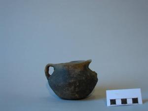 Anfora biconica di piccole dimensioni, labbro leggermente esoverso, carena arrotondata, fondo piano-convesso; tra orlo e carena sono impostate due piccole anse a gomito, con braccio superiore orizzontale (di una si conservano solo gli attacchi).