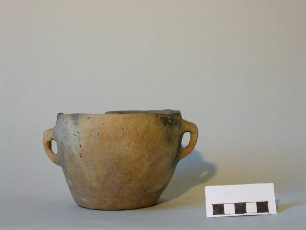 Vaso troncoconico, orlo piatto, parete leggermente convessa, fondo piatto; al di sotto dell'orlo sono impostate due piccole anse a nastro, dal profilo leggermente a gomito.