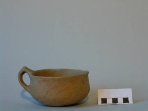 Tazza carenata, orlo arrotondato leggermente esoverso, parete verticale rettilinea, carena arrotondata, breve vasca a calotta con fondo ombelicato; tra ansa e carena è impostata un'ansa a gomito con braccio superiore obliquo, con apice a bottone conico appena accennato.