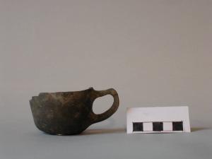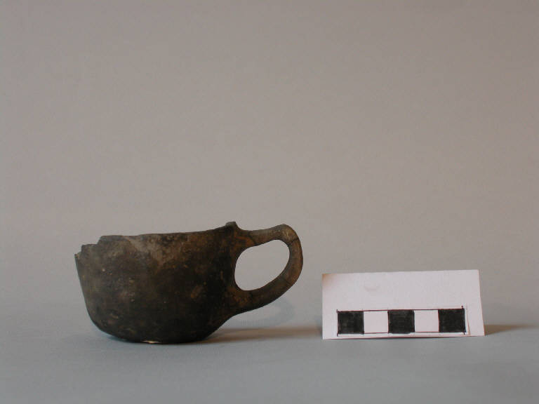 Tazzina troncoconica, orlo arrotondato, parete rettilinea, fondo piatto; sotto l'orlo è applicata un'ansa a gomito con braccio superiore leggermente obliquo verso l'alto.
