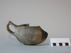 Tazza carenata, orlo assottigliato, breve labbro esoverso, breve parete verticale concava, carena pronunciata, vasca a calotta, accenno di fondo ombelicato; tra orlo e carena è impostata un'ansa sopraelevata a gomito con braccio superiore fortemente obliquo verso l'alto e breve appendice asciforme.