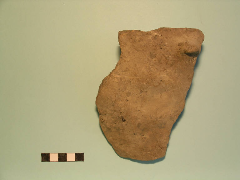 Frammento di vaso troncoconico, orlo arrotondato, breve labbro introflesso, parete rettilinea; all'attacco del labbro è applicata una piccola presa a linguetta orizzontale.