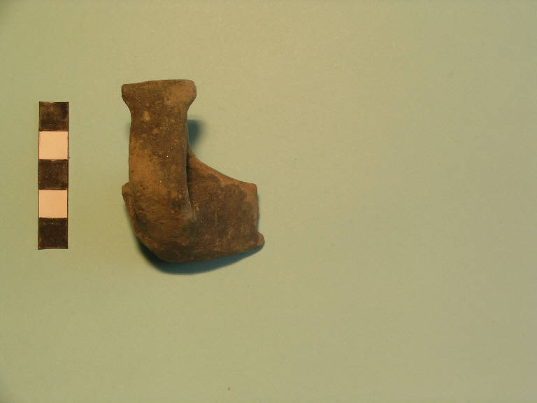 Capeduncola con orlo arrotondato, parete verticale rettilinea, carena arrotondata; ansa sopraelevata a T (sommità rettilinea e appendici con sviluppo orizzontale); alla base dell'ansa internamente due bugnette.