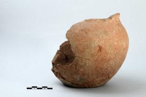 Olla in ceramica comune priva dell'orlo, probabilmente estroflesso, l'olla presenta il collo concavo, distinto dalla spalla; il corpo è di forma ovoide; il fondo è piano.