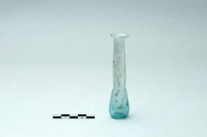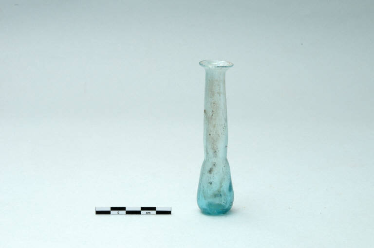 Balsamario tubolare in vetro soffiato bianco-azzurro, ventre piriforme orlo svasato e arrotondato