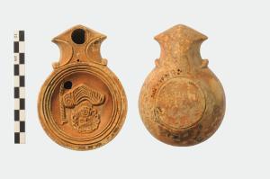Lucerna con becco ancolare a volutr, il disco è decorato da tre cerchi concentrici impressi che circondano una figura ,in rilievo, maschile da volto barbuto con scettro.