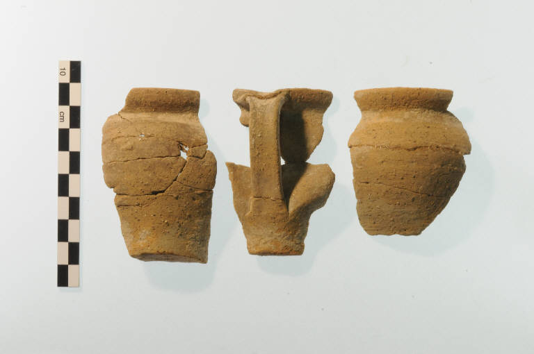 Boccale di tipo retico caratterizzato dalla depressione funzionale della parete in corrispondenza dell'ansa a nastro, orlo svasato e base piana.