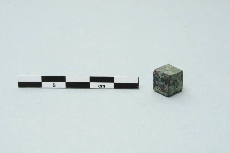 Dado da gioco di forma cubica dacorato a bulino da due cerchiolini puntati su ogni faccia