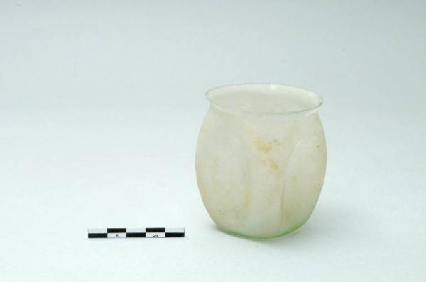 Bicchiere in vetro soffiato bianco, orlo svasato,il corpo è decorato da quattro depressioni, apodo con base leggermente concava.