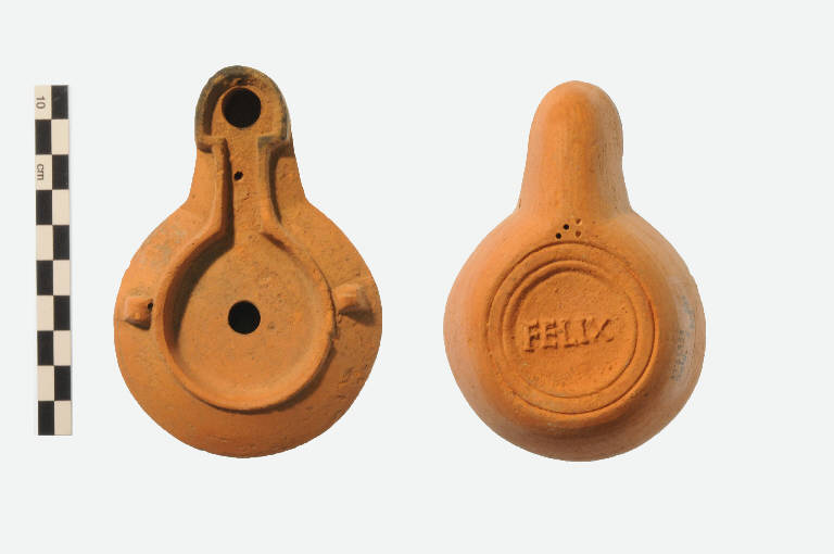 Lucerna a canale aperto con due borchiette sulla spalla, foro di sfiato posizionato a metà circa del canale,