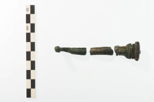 Fibula in bronzo ad arco semplice la cui lamina è decorata da due costolature longitudinali all'interno delle quali vi è incisa una fila di puntini, la larga staffa termina con un pomello