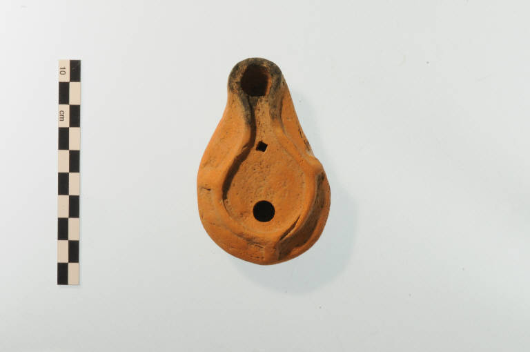 Lucerna a canale aperto, spalla dal profilo irregolare con tre borchiette appena accennate, foro di sfiato di forma quadrangolare posto tra disco e canale