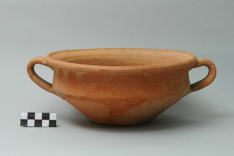 Bacile con orlo estroflesso munito di scanalatura, vasca carenata, anse a nastro con quattro scanalature, base piana, restano tracce dell'ingobbio esterno color crema.