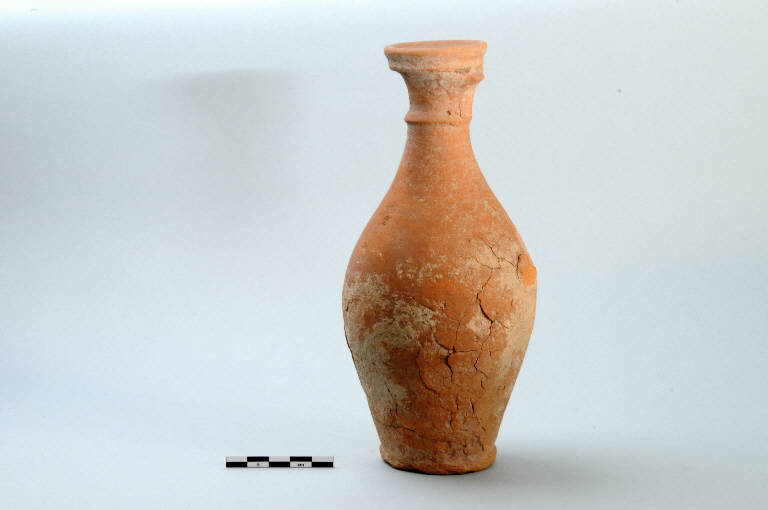 Olpe in ceramica comune con orlo arrotondato a doppio listello, il collo, alto e stretto, è interrotto circa a metà da una cordonatura, il corpo ha una forma allungata, il fondo è piano con piede ad anello. Manca l'ansa della quale resta solo l'attacco.