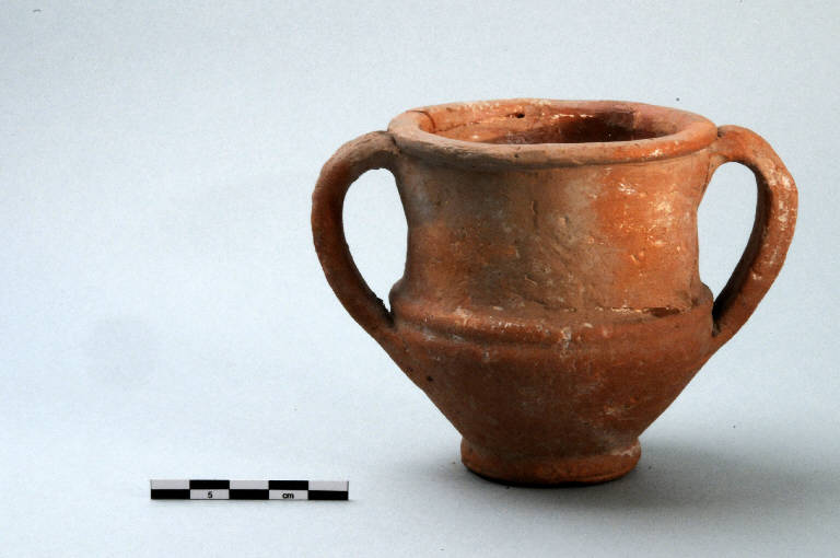 Boccale biansato carenato; orlo estroflesso, anse costolate impostate sotto l'orlo e appoggiate alla carena arrotondata, corpo biconico e piede a disco.