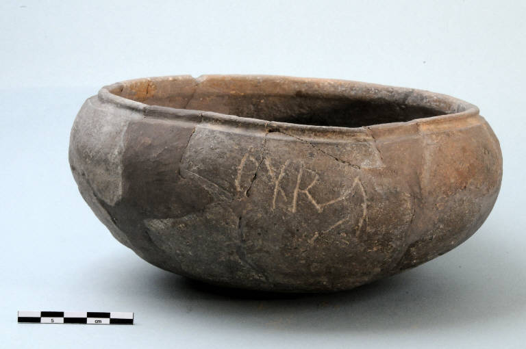 Ciotola in argilla grezza ad impasto grigio, orlo irregolare ripiegato verso l'esterno distinto dalla spalla mediante un gradino.