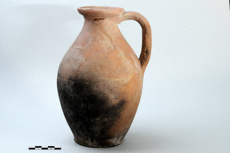 Olpe a bottiglia con corpo allungato, orlo estroflesso sotto cui si imposta un'ansa a gomito terminante sulla spalla, fondo piano.