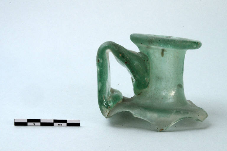 Bottiglia monoansata in vetro verde chiaro, ventre a sezione quadrata, orlo estroflesso appiattito superiormente e ansa costolata ripiegata a gomito, impostata sulla spalla e saldata sul collo a metà altezza.