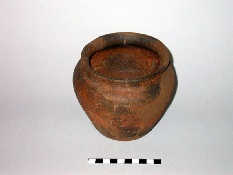 Olletta in ceramica comune da fuoco con orlo estroflesso, spalla rialzata, corpo troncoconico e fondo piano.