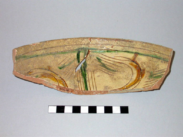 Frammento di ciotola in ceramica ingobbiata, graffita, dipinta ed invetriata di forma a cavetto sub - emisferico con cordone orizzontale decorato a tacche