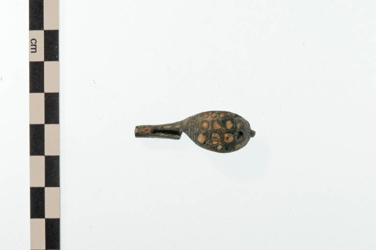 Fibula in bronzo a "piccola sanguisuga", piede (mancante) presumibilmente sferico e applicazioni in pasta biancastra.