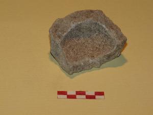 Frammento di fondo e parete di mortaio in pietra calcarea biancastra. Vasca troncoconica e fondo piano. Ritrovamento di superficie.