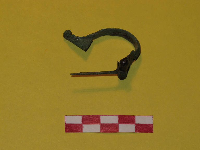 Fibula in bronzo di tipo Aucissa, integra. Decorazione a perline circolari in rilievo sulla costolatura centrale sopra l'arco.
