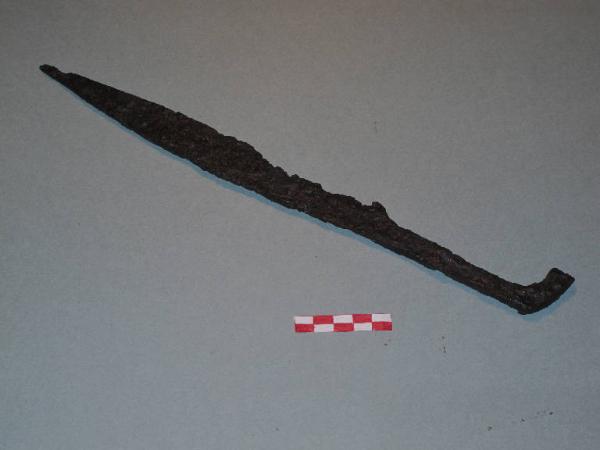 Esemplare quasi integro di grande coltello in ferro con lama a dorso leggermente curvo e codolo a sezione rettangolare terminante a gomito. Lacunoso di piccola parte del taglio della lama. Lungh. lama cm 23; lungh. totale cm 34; spess. max lama cm 3. Datazione: I-II secolo d.C. Provenienza: Acquafredda, loc. Borgo dei Lupi, necropoli romana, tomba 17.